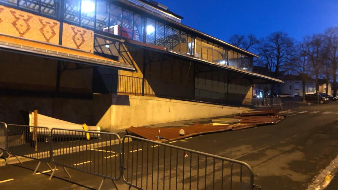 Circulation interdite à Rethel autour des halles et de la Promenade des Isles en raison d'un arbre abattu par la tempête et tombé sur une partie de la toiture des halles qui s'est décroché. Le maire Joseph Afribo rappelle que ces dégâts n'ont aucun lien avec les récents travaux, dont la toiture ne faisait pas partie. Crédit photo : L'Ardennais.