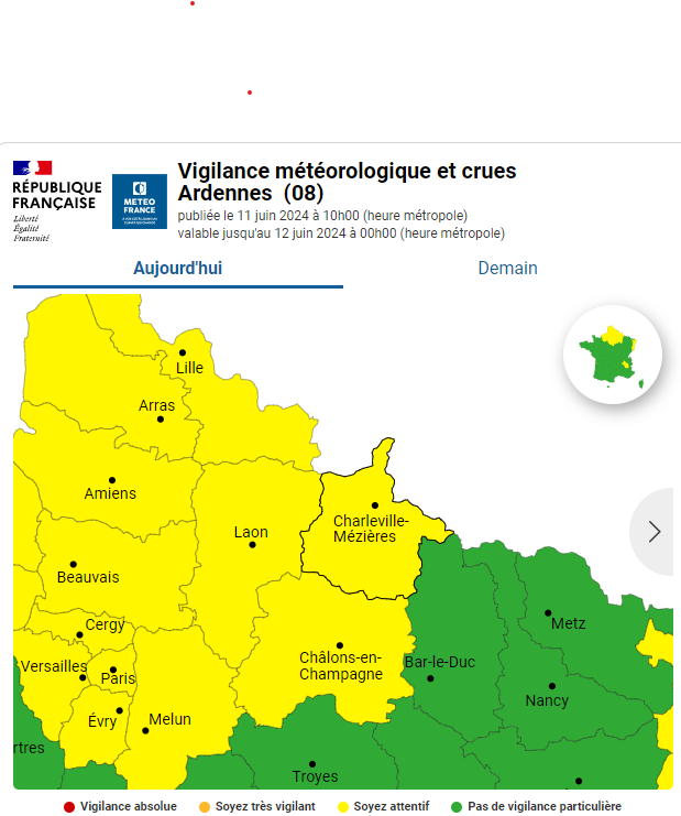 Les Ardennes placées en vigilance jaune par Météo France pour le risque d'orages aujourd'hui. La vigilance commence à 14h pour se finir à 20h.