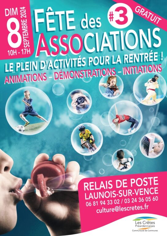 Ce dimanche 8 septembre 2024 aura lieu de 10h à 17h, la grande fête des associations aux relais de poste à Launois-sur-Vence. L’occasion pour les visiteurs de découvrir toute la richesse des activités proposées par les associations ardennaises.
